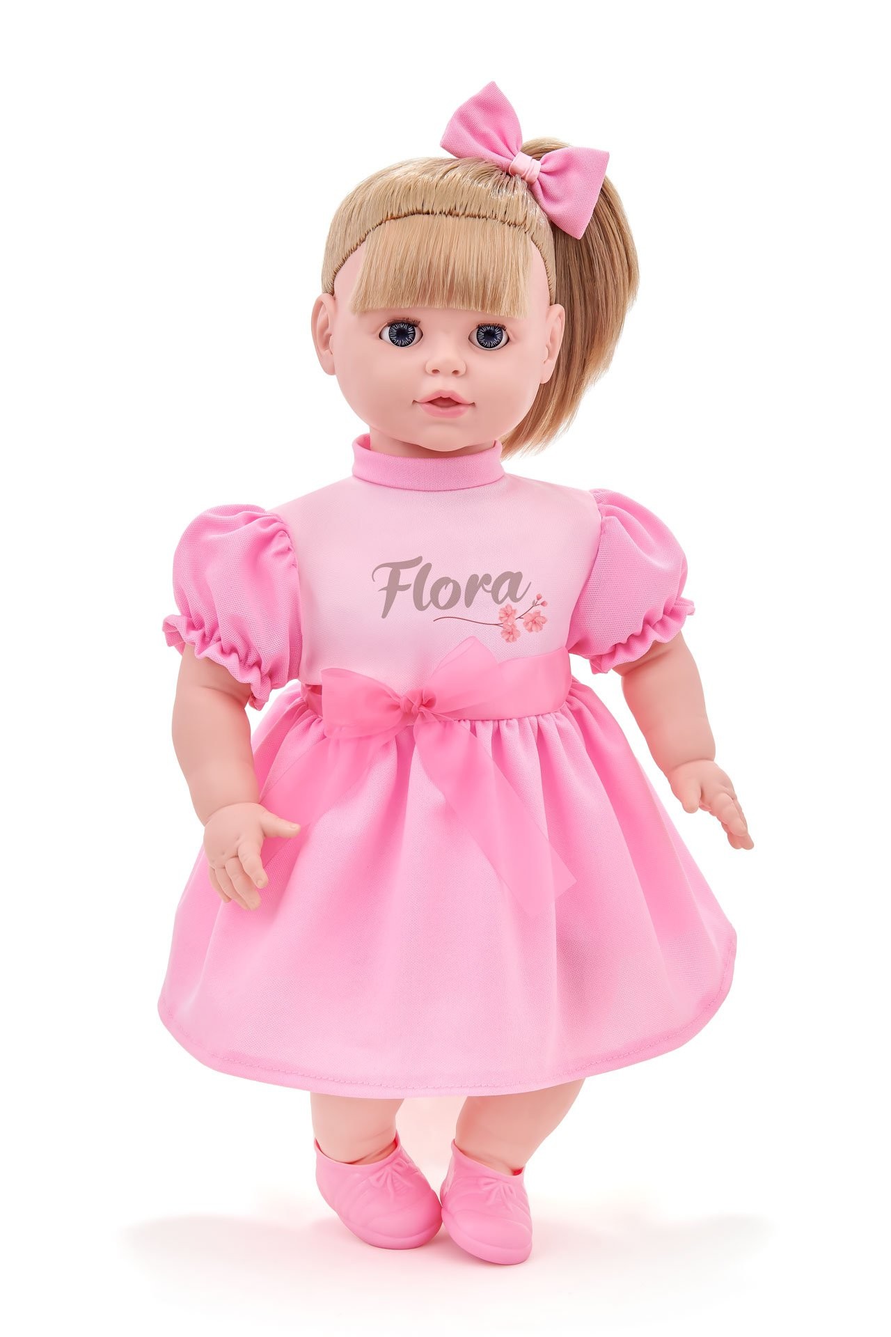 A Boneca Flora é delicada, encantadora e cheia de personalidade. Fala 30 frases divertidas que tornam a brincadeira ainda mais especial. Basta apertar a barriguinha para ouvir e interagir com ela. Possui lindo vestido rosa com laço e acabamento delicado. Seu cabelo com franjinha e rabo lateral completa o visual charmoso. Acompanha sapatinhos combinando com o look. Estimula a imaginação e o carinho durante as brincadeiras. Indicada para crianças a partir de 3 anos.