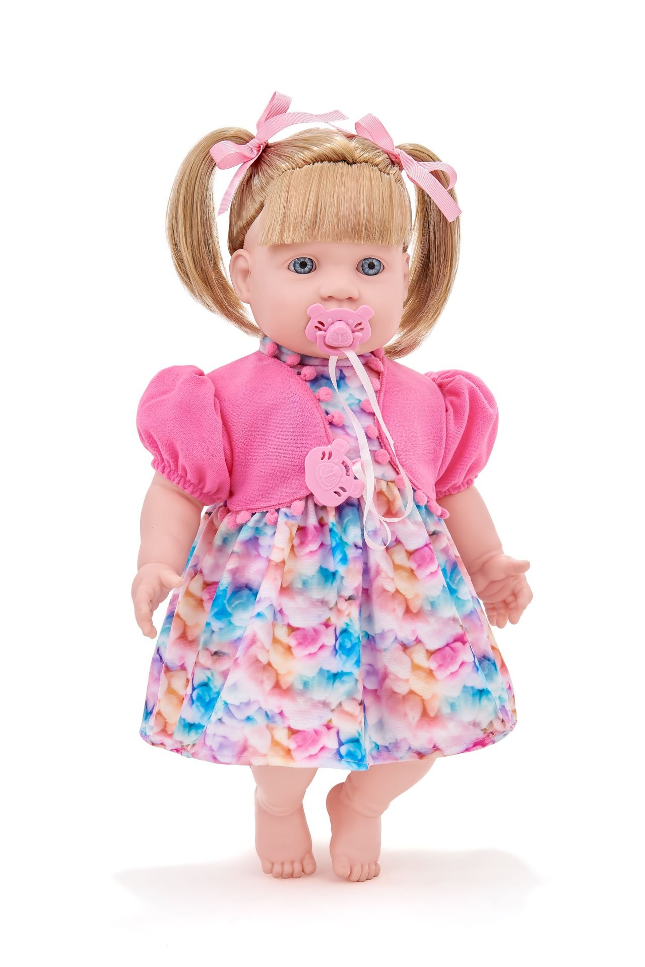 Com lindos cabelos loiros presos em maria-chiquinhas com laços, traz ainda mais charme à brincadeira.
