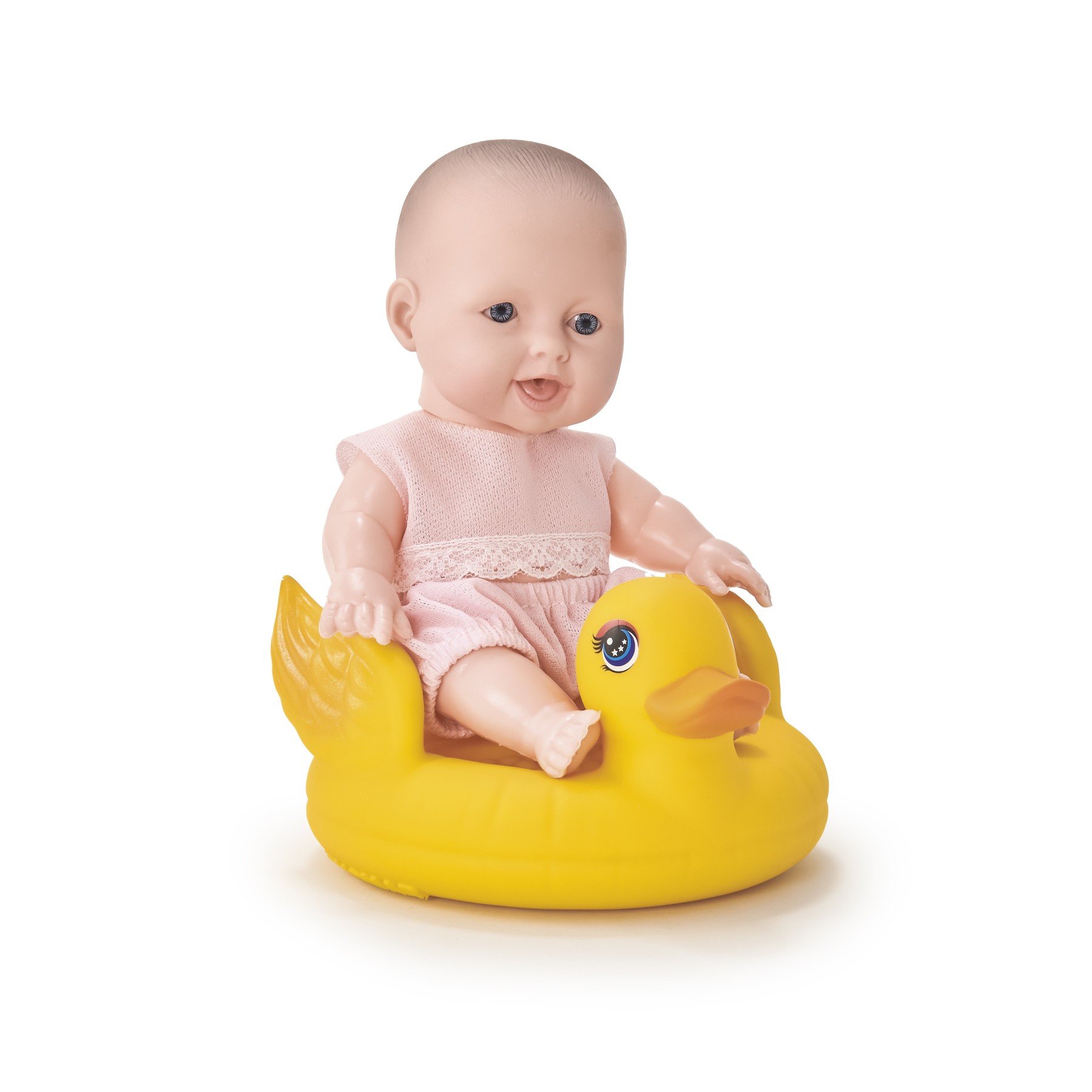 Esse bebê fofinho adora passear na água montando em seu patinho amarelo. Com carinha alegre e roupinha delicada, ele encanta desde o primeiro sorriso. O pato é perfeito para transformar a banheira em uma lagoa cheia de diversão.