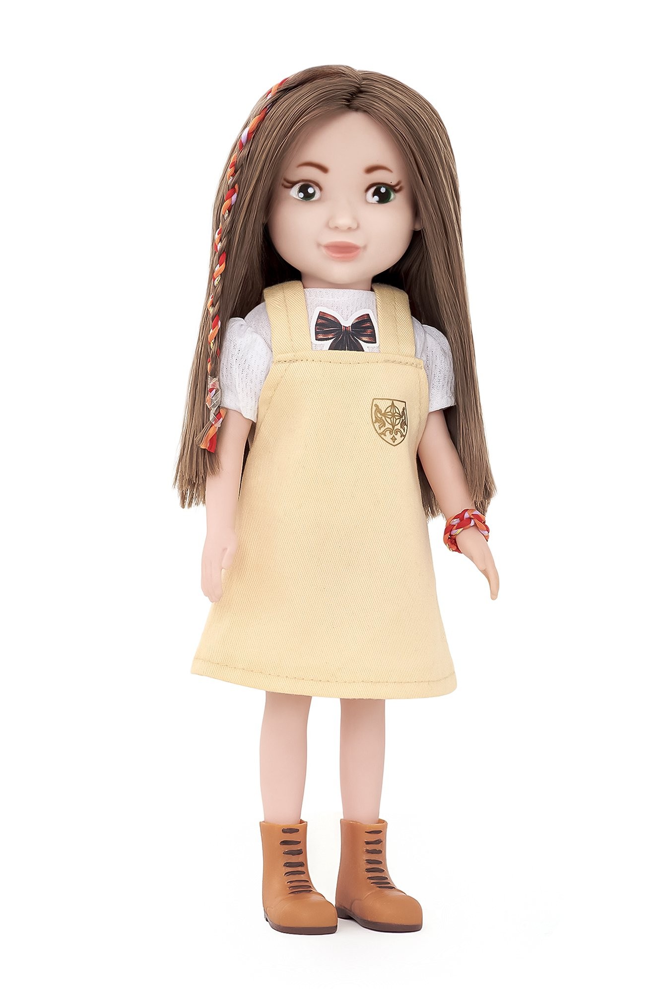Com seus lindos cabelos longos e mechas coloridas, ela está pronta para explorar novos mundos. Seu vestido delicado e botinhas estilosas deixam a brincadeira ainda mais especial.