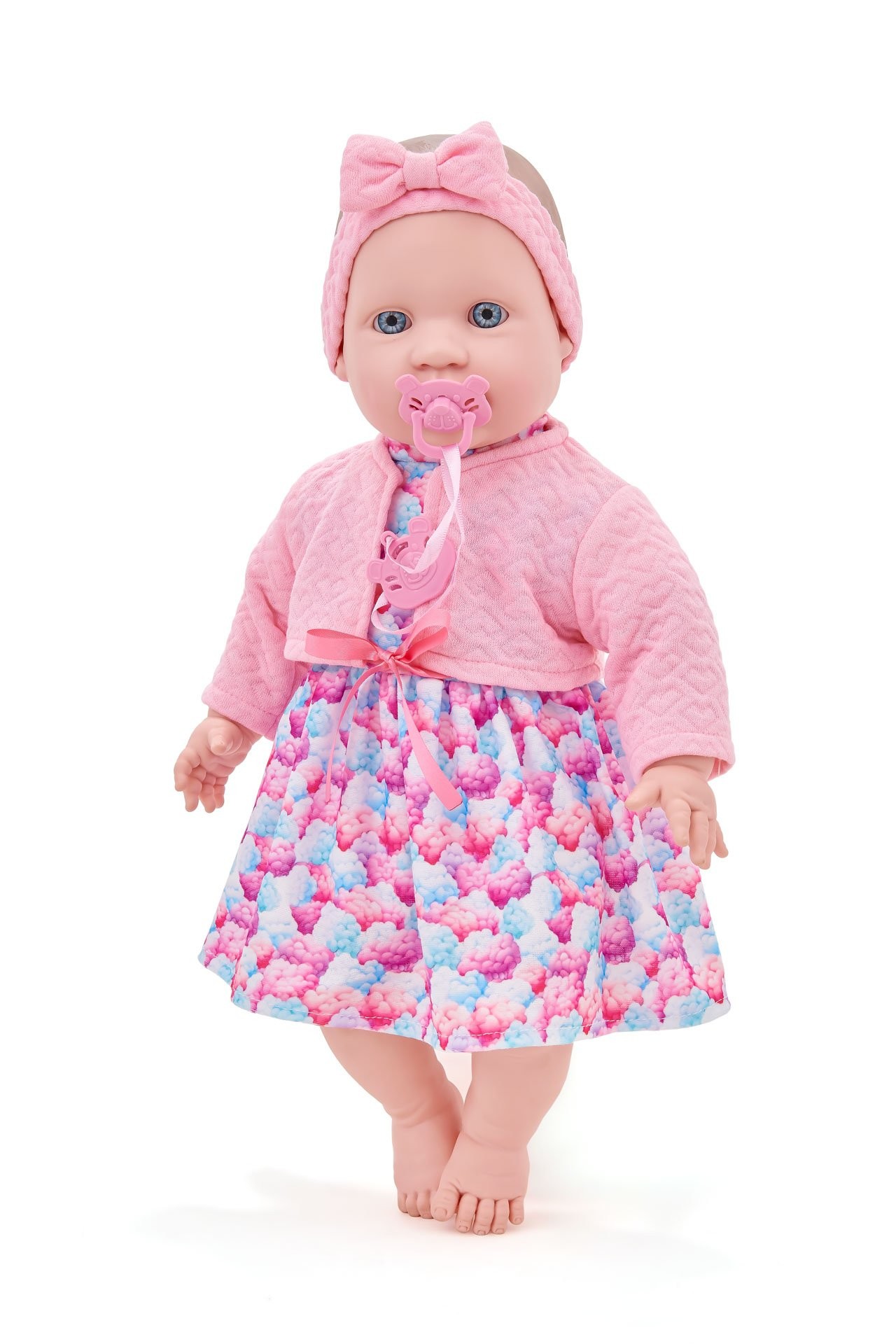 Com visual estilo bebê, acompanha tiara com laço e roupinha suave em tons delicados.